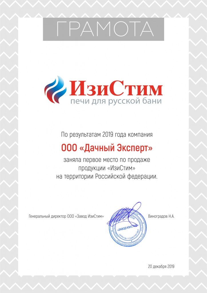18. 2019 год - первое место по продаже продукции, печей "ИзиСтим" на территории Российской Федерации